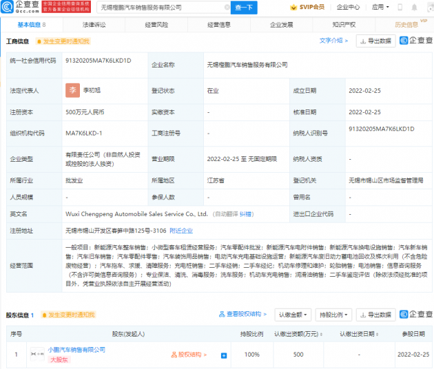 关键词: 小鹏汽车 无锡成立新公司 注册资本 本500万元人民币