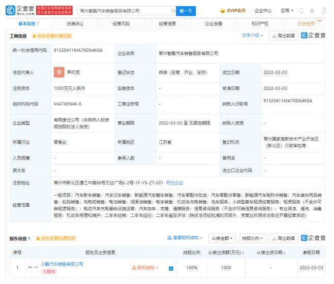 企查查APP显示,3月3日,常州智鹏汽车销售服务有限公司成立,法定代表人为李初旭,注册资本1000万元人民币,经营范围包含:电车销售;机动车充电销售;小微型客车租赁经营服务;二手车鉴定评估等。企查查股权穿透显示,该公司由小鹏汽车销售有限公司100%控股。