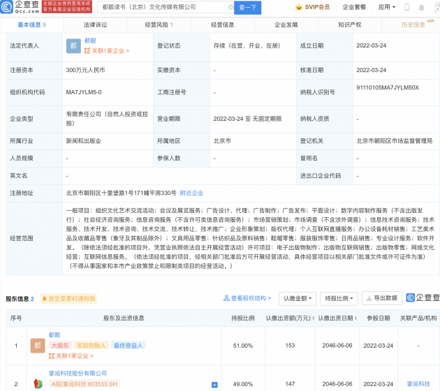 企查查APP显示,3月24日,都靓读书(北京)文化传媒有限公司成立,法定代表人为都靓,注册资本300万元人民币,经营范围包含:电子出版物制作;出版物互联网销售;出版物零售;网络文化经营;互联网信息服务等。企查查股权穿透显示,该公司由都靓、掌阅科技(603533)共同持股。公开资料显示,都靓现担任掌阅科技内容营销负责人,2019年起,其在互联网平台发布《自私的基因》、《白夜行》等读书分享视频,并被网友所熟知,成为泛知识领域的红人。